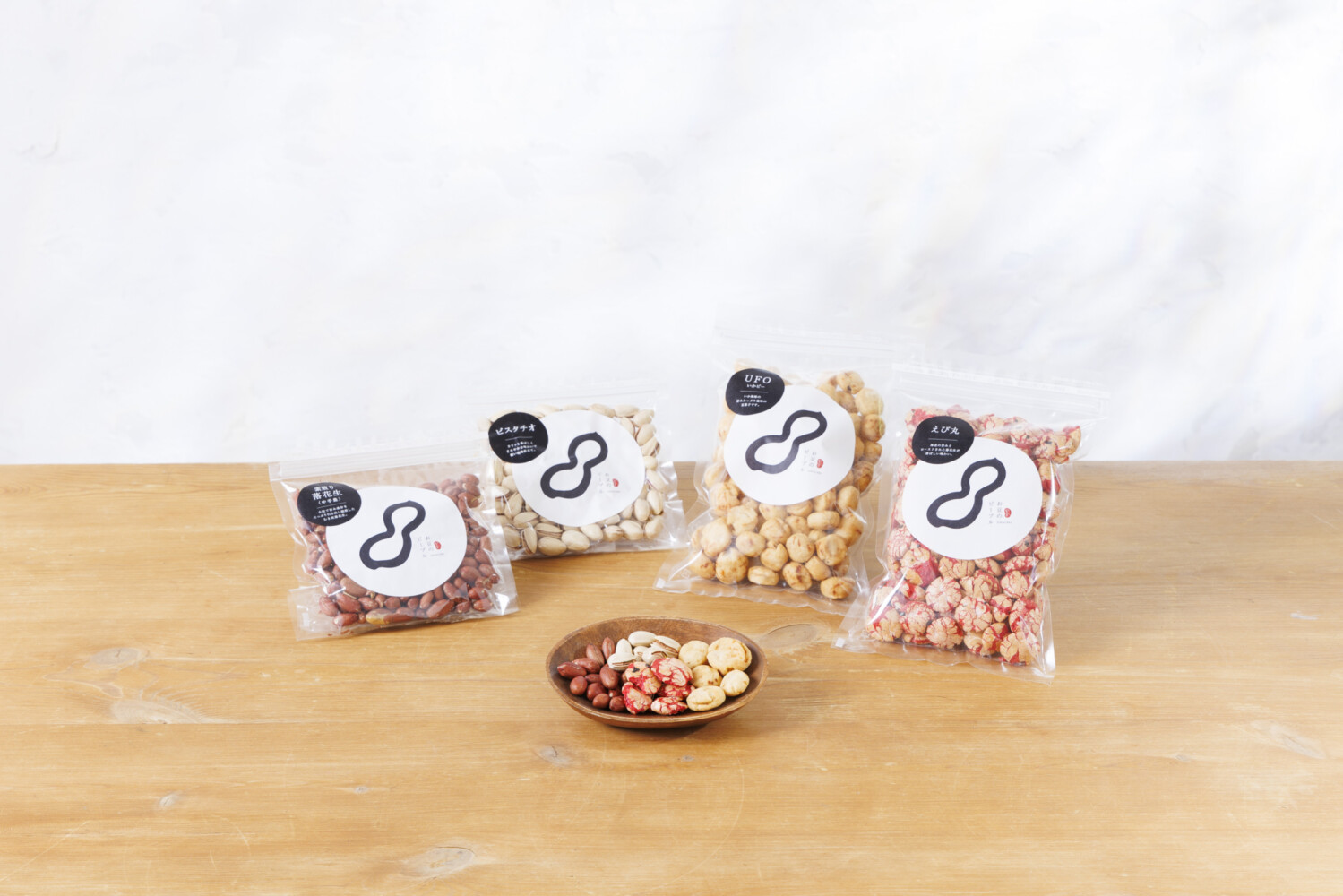 お豆のピープルでは、豆菓子2種類とお店自慢の焙煎落花生2種類をセットにした「オススメセット」を販売しています。豆菓子は、イカの切り身を混ぜ込んだ「UFO」と、えびの香りがふわっと広がる「えび丸」という2つの海鮮系フレーバーです。どちらも海鮮の出汁が口の中に広がり、おつまみにぴったりの豆菓子です。また、辛み成分が入っておらず甘塩っぱい味わいなので、子どもがいるご家庭への手土産としても活用いただけます。