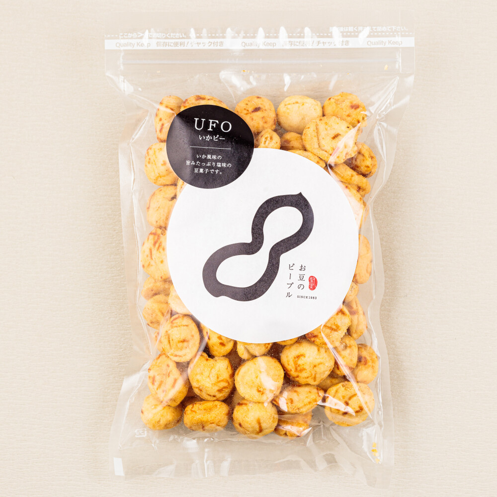 ユニークなネーミングの「UFO」は、円盤のような見た目から名付けられた、遊び心あふれる豆菓子です。 特徴は、刻んだイカの切り身が練り込まれている点です。ザクザクしたおかき部分は絶妙な塩加減で、もち米の甘みを感じます。イカピーと呼ばれることもある根強いファンが多い豆菓子で、イカの豆菓子だけをたっぷり味わいたいという方にもおすすめです。単体で販売している商品が少ないなか、お豆のピープルでは500gの大容量パックも用意しております。一粒ひと粒が大きく、食べ応え十分で満足感がある商品です。